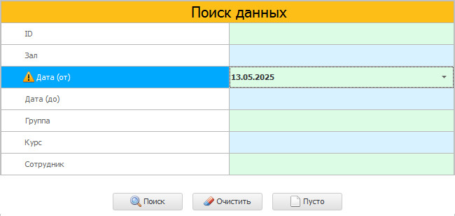 Как только выбран критерий, поле выделяется восклицательным знаком — это значит, что фильтр активен. Например, чтобы найти занятия «начальной группы», достаточно ввести название — система отобразит только соответствующие записи.