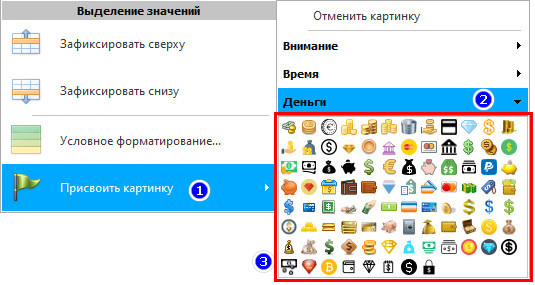 Любому текстовому значению в таблицах УСУ можно присвоить изображение. Это особенно удобно при визуализации категорий, статусов и способов оплаты.