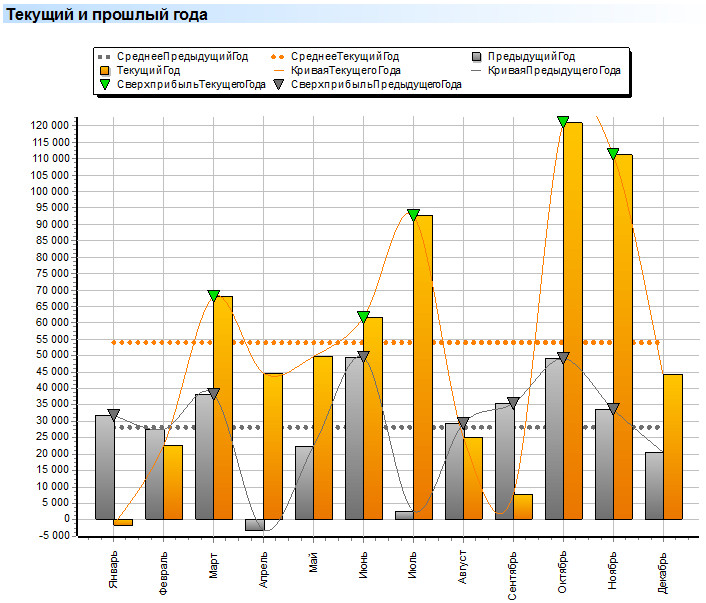 Прибыль спортивной организации рассчитывается по аналогии с учебным центром. Кроме показаний за каждый месяц работы некоторые предприятия просят добавить на заказ расширенную аналитику. Например, более яркие столбики на диаграмме могут обозначать показатели текущего года, а серые столбики - прошлогодние данные. При таком представлении будет ясно видна динамика относительно прошлого отчетного года.