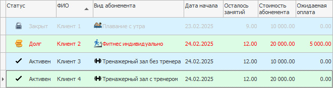 Администратор может настроить таблицу под себя — вывести только те данные, которые нужны в процессе работы: информацию о деньгах, занятиях, посещениях и других параметрах.