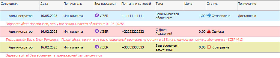 И куда же без информационных уведомлений. Такой вид рассылки не имеет никакого отношения к заказам или рекламе, но это не делает его менее значимым, ведь он помогает поддерживать актуальную информацию. Например: если у вас сегодня отменились все групповые занятия или изменилось их расписание, или, возможно, по техническим обстоятельствам вам пришлось закрыться раньше. В таких ситуациях сразу видно важность интеграции мессенджеров с программным обеспечением. Вместо того, чтобы менеджеру искать список клиентов, писать каждому из них одно и то же сообщение тратя на это огромное количество времени, за него всю работу выполнит программа фитнес клуб. Достаточно будет в программном обеспечении, в специальном модуле, сделать определенный фильтр, подготовить шаблон и запустить рассылку. Но следует быть аккуратным. Так как такие интеграции программного обеспечения с Viber являются не официальными, и вы можете быть подвергнуты блокировке.