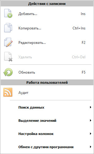 Контекстное меню – это список команд, вызываемый правой кнопкой мышки, который позволяет провести быстрые действия с данными, с которыми пользователь взаимодействует в данный момент. Например, если нажать на определенную строку правой кнопкой мыши, то появятся такие действия как: «Копировать», «Добавить», «Удалить» и так далее.
