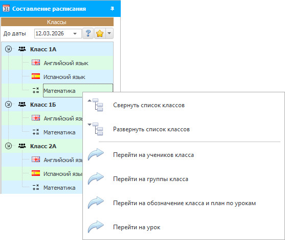 В одном из самых главных и наиболее используемых окон программы для составления расписания со списком классов учебного заведения есть сразу несколько функций для того, чтоб вести быстрый учет учебных курсов. CRM система учета учебных курсов позволяет при необходимости быстро переходить в главные справочники информационной системы: