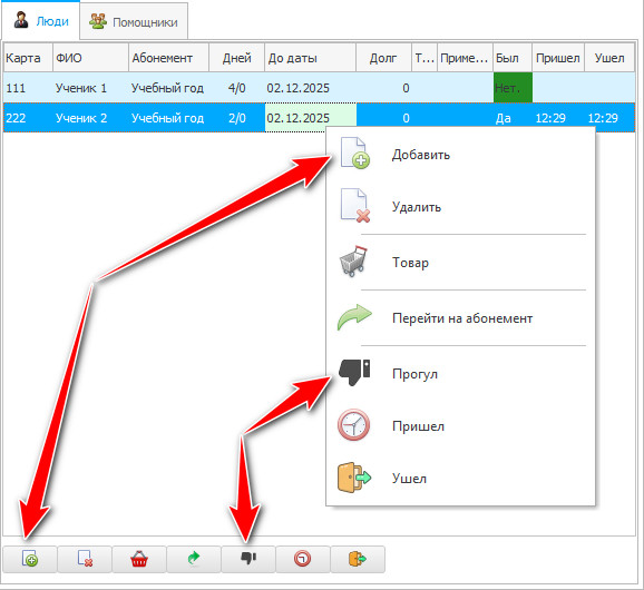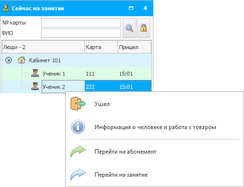 Так же очень удобно использовать контекстное меню с учащимися, которые в данный момент находятся на занятии. Все самые важные действия можно делать легко и быстро. Например: отметить уход студента, увидеть полную информацию о нем или перейти на учебный абонемент. Все эти действия в разы увеличивают скорость работы и помогают администратору избежать дополнительного стресса в моменты, когда нужно сориентироваться за считаные секунды.