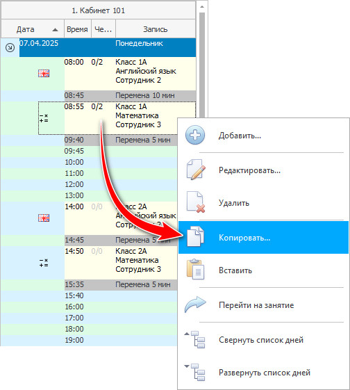 Возможности всплывающего списка команд отличаются в зависимости от окна, в котором работает пользователь. CRM система учета учебных курсов для быстрой работы с расписанием предоставляет отдельные клавиши, которые значительно отличаются от окна «Кабинеты». Одними из нужных и часто используемых команд являются «Копировать» и «Вставить». Допустим, ученик постоянно посещает занятия согласно своему абонементу, но вдруг он просит у вас дополнительное занятие на другой день. И чтоб администратор не тратил много времени на создание нового занятия, ему достаточно просто скопировать уже имеющиеся занятие и вставить на новое время.