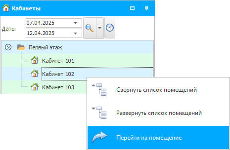 Рассмотрим на примере кабинетов, которые находятся на главном экране окна с расписанием. Если у вас большой учебный центр и все кабинеты не помещаются в окно интерфейса, то с помощью нажатия правой кнопки мыши можно легко развернуть, либо же свернуть все группы кабинетов, которые могут быть скомпонованы по этажам или учебным корпусам. А также имеется возможность быстро перейти в справочник по этому кабинету, если нужно провести в нем какие-то изменения.
