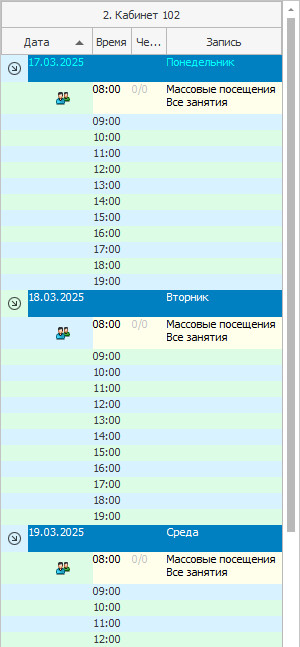Для этого в расписание создается запись «Массовые посещения». При данном формате не важна конкретика по преподавателю и времени проведения. Просто все ученики отражаются в составе одной записи. Тем самым будет просто списываться количество уроков.