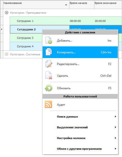Например, пользователю достаточно внести только одного тренера в справочник сотрудников, указав о нем полные сведения. А других сотрудников можно создать копированием с предыдущего, если они работают в том же самом филиале, ведут те же самые курсы и условия по сдельной оплате труда у них тоже совпадают.
